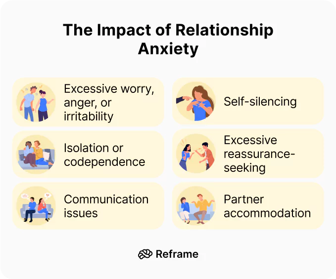 Relationship anxiety can significantly impact both our mental and our physical health. Constant worry and fear can lead to chronic stress, which can weaken the immune system, disrupt sleep patterns, and increase the risk of developing anxiety or depression.