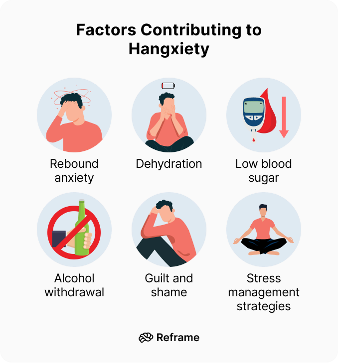 5. Guilt and shame. Alcohol can impair our judgment and decision-making abilities, leading to potentially regrettable decisions during a night of drinking. Waking up with a hangover and remembering (or not remembering) the events of the previous night can cause feelings of guilt, shame, and anxiety, thus feeding into hangxiety.