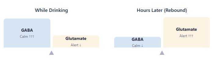 Picture a seesaw on a playground. Alcohol sits down hard on the "calm" side, pushing it all the way down. But your brain, trying to keep balance, starts loading weight onto the "alert" side. When alcohol gets up and walks away, the alert side comes crashing down with all that extra weight — launching your anxiety sky-high. The good news? Without alcohol constantly messing with the balance, your brain gradually removes that extra weight, and the seesaw settles back to center.